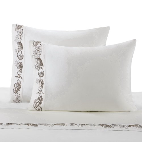 The Island Grove sheet set features sea life inspired motifs embroidered on the cuff of the pillow cases and flat sheet The sheet is white with brown embroidery Queen set includs one flat sheet one fitted sheet and two standard pillowcases 250-thread count sateen cotton with embroidered hem Measu