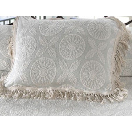 These shams are 100 cotton matelasse weave with alternating circular medallions and crossed leaves creating a classic 19th century pattern true to its authenticity and loomed to last It is richly finished with double knotted string fringe on sides and rounded corners King shams measure 20 inches