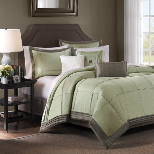 MP10-135 Size Queen Carlyle is a beautifully constructed comforter that is perfect for any room in your home The soft celedon green in the center has satin embroidery stitching and flat pintucks that offer texture and dimension to this faux silk dupioni fabrication The comforter and shams are fra